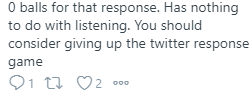 And I’m assaulted with this quote tweet. Obviously a fellow stoolie who follows me and uses a reference to a BigCat bit. But what the F#@$ does this have to do with listening with music and why bother with this?