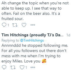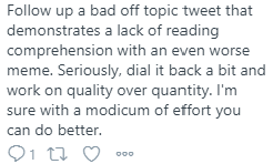 Sorry, but I can’t let it go. My response. Maybe it’s to judgy? But I think I’ve been around a bit and can always lend a fellow twitter user a hand with improving the reply game. Reviewing the person’s tweets for a couple of days, they are filled with a ton of single sentence responses.