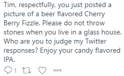 The response was to peel out an untappd beer tweet posted prior to the start of this little interaction, not entirely read it, and try to beer shame me. First, never, ever, use “respectfully” in a response. It’s such a trigger that everything you say after that will just be an attempted attack. And never, ever, ever, try to beer shame me. My tweets on the weekends are filled with check-ins on untappd. Stop following me if you can’t handle beer tweets on the weekend. I like and appreciate good craft beer.