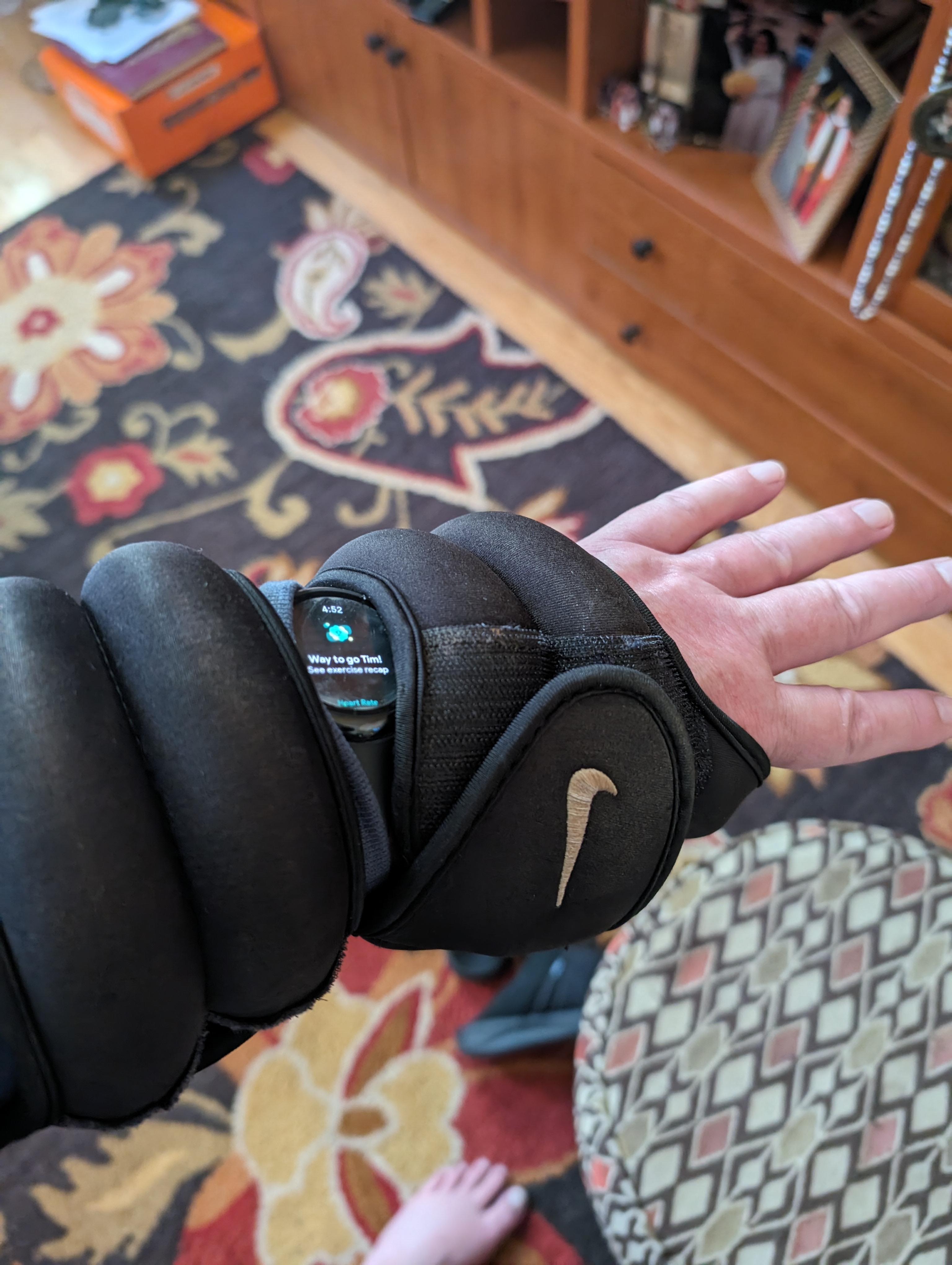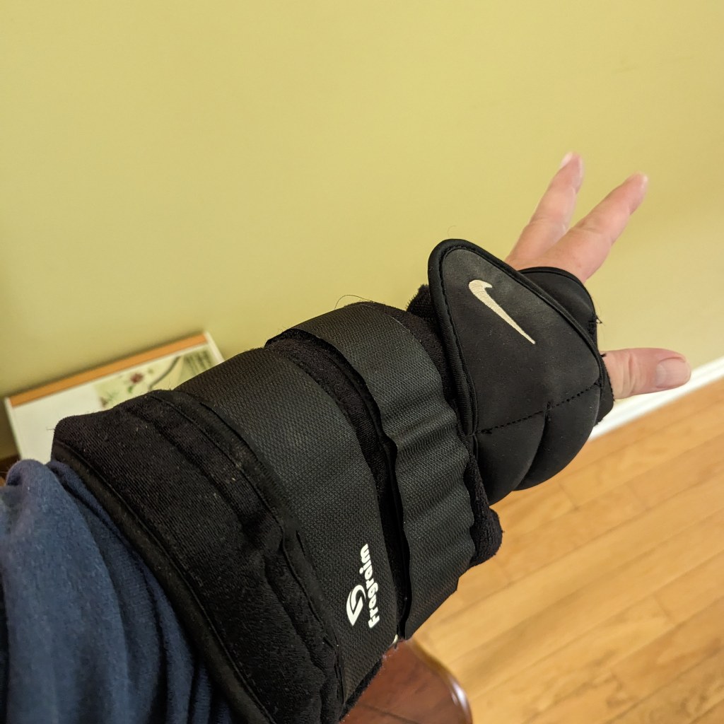 These are the 2.5lb Nike wrist weights that I wear on my walks. Here I’ve taken a second set and wore them on my forearms for a total of 5lb when walking.
