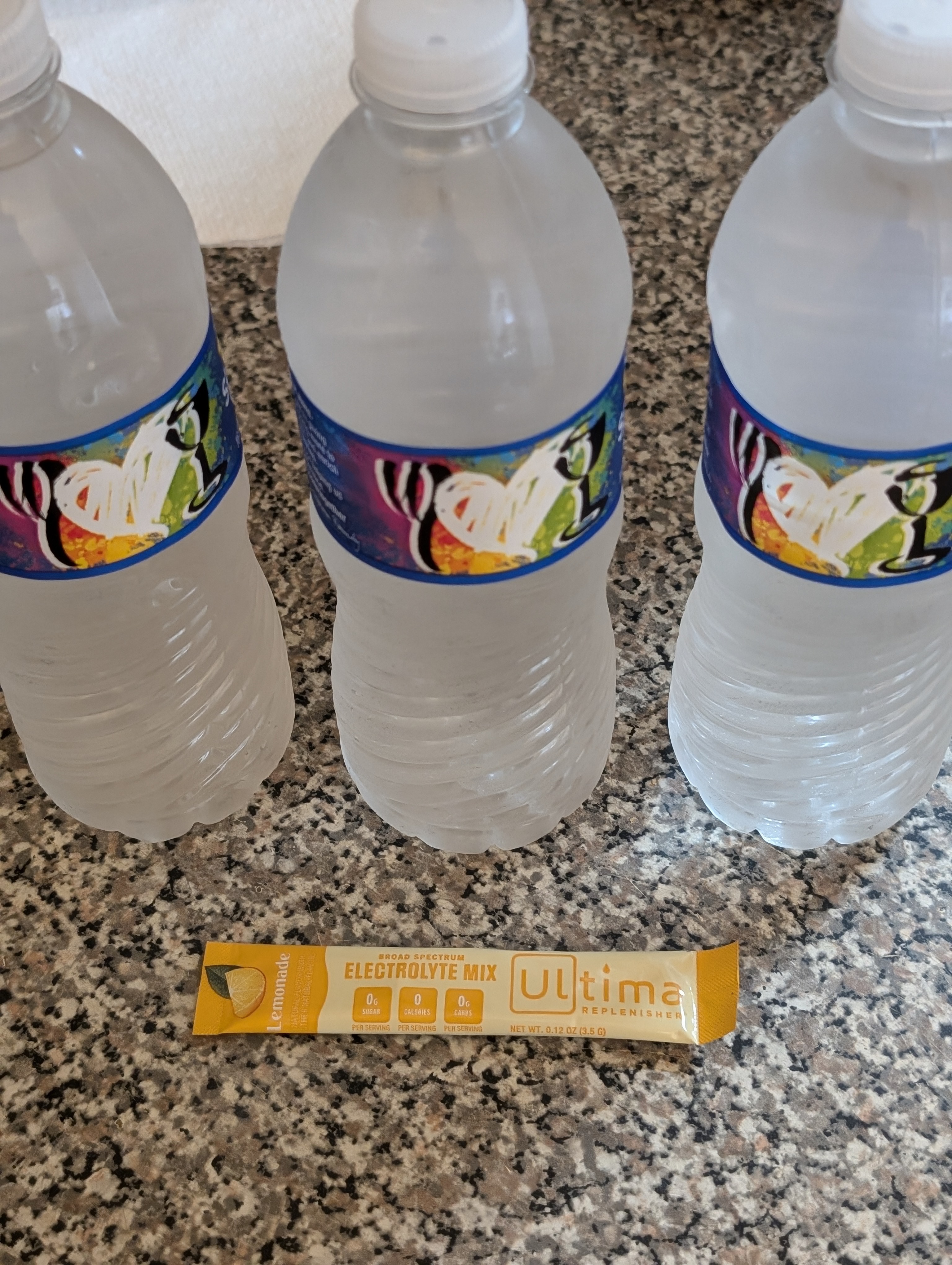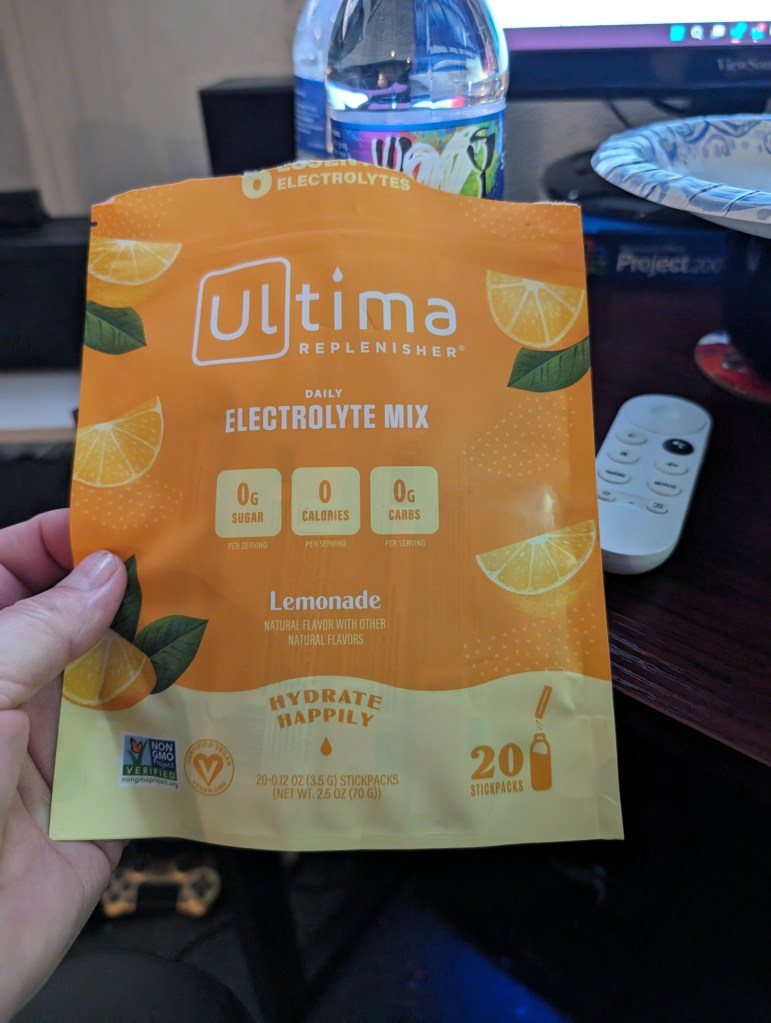 I drink 3 16.9 oz water bottles with a package of electrolyte powder split amongst them after ever walk.
