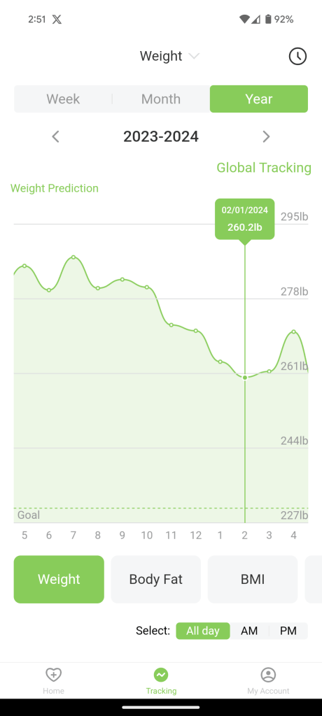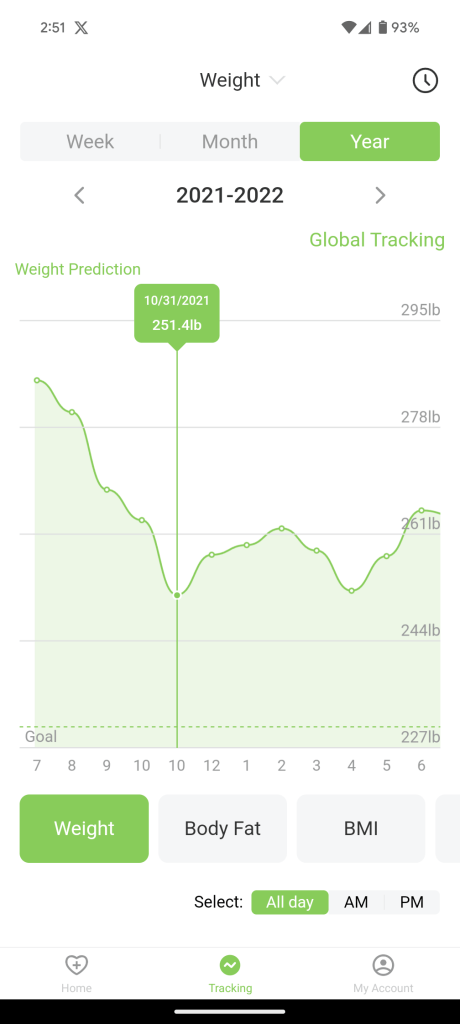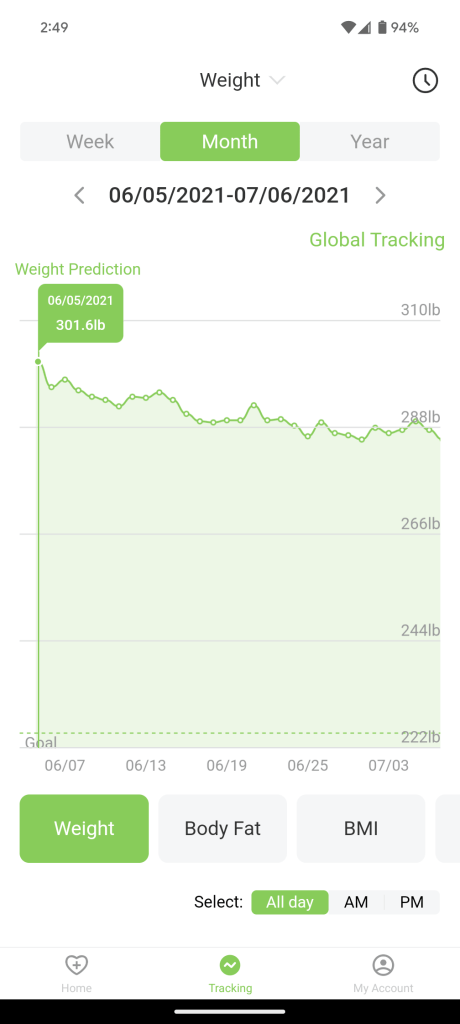 These are screen shots from the scale app that records via Bluetooth my weight when I step on the scale. My first measurement was 301.6 on 6/5/2021