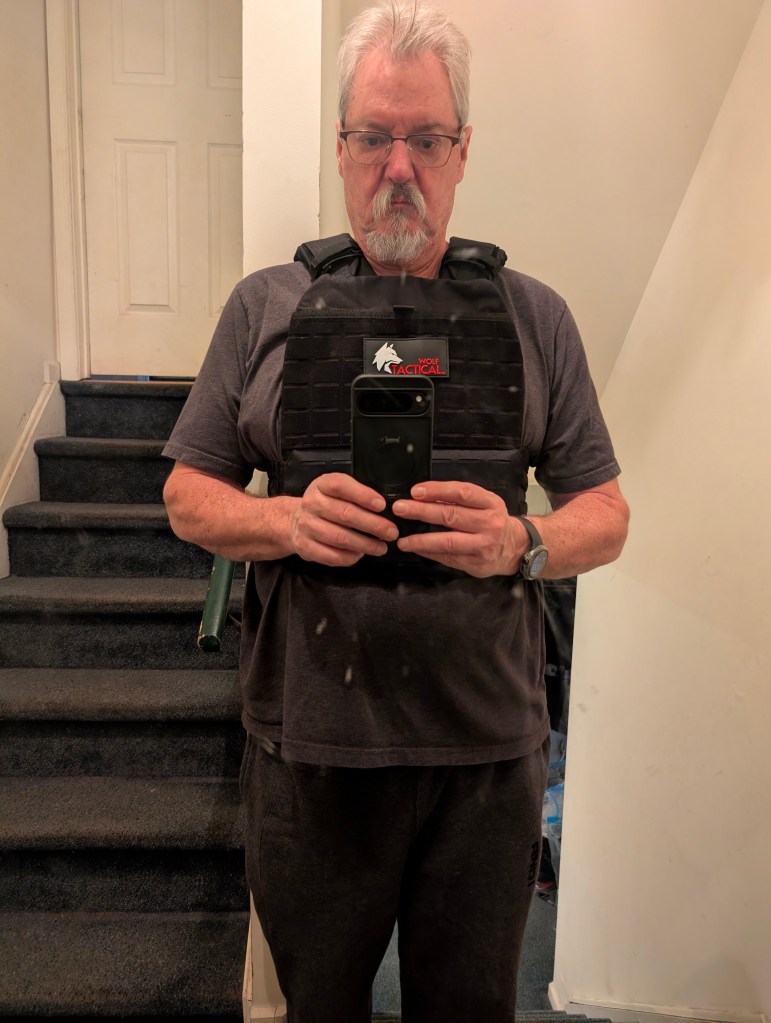 There’s 2 5.75lbs curved weight plates and a 2.5lbs vest. This will be 14lbs to carry. For the past several days I’ve been walking with a total of 10lbs via some wrist weights that I’ve used often.