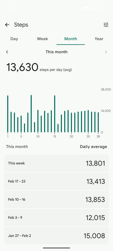 This time of year with the weather challenges my steps, miles, minutes are reduced. Looking forward to warmer weather and more steps, miles, minutes