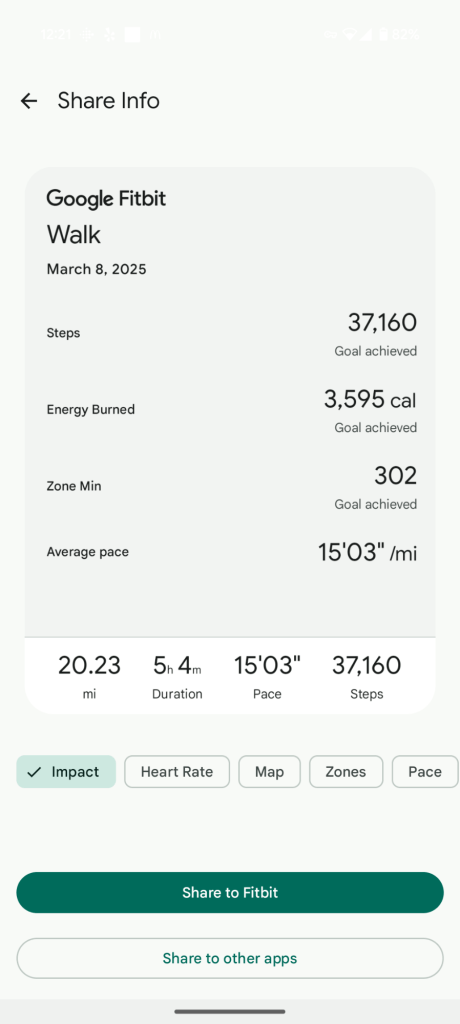 Today I completed my longest walk of 20 miles. This is up 5 miles from last week’s Saturday walk. Really satisfied with the distance. Tomorrow I’ll do a standard 6 mile weighted vest walk to recover. The plan will be to repeat the same next week. Then add the weight vest to the walk.