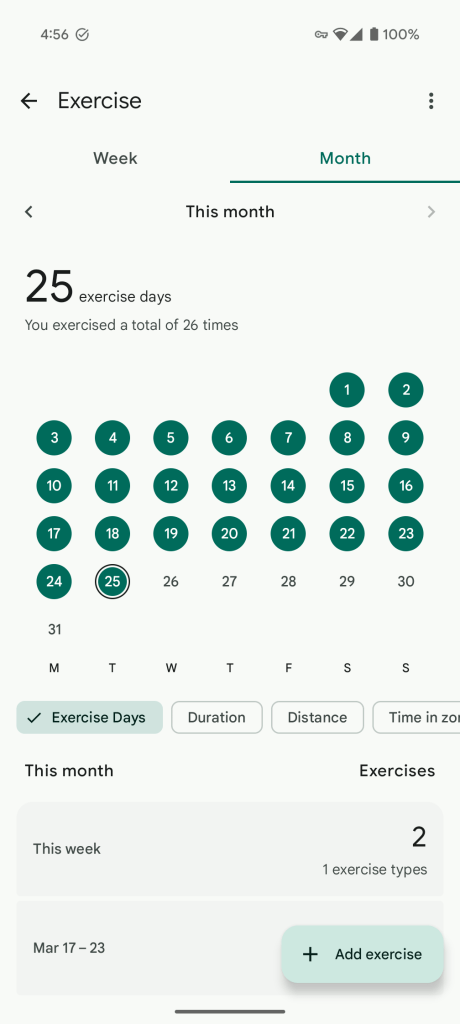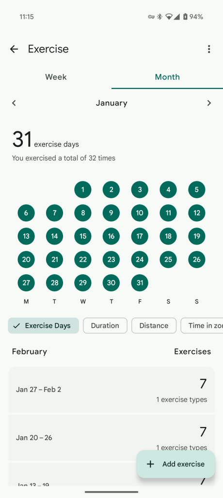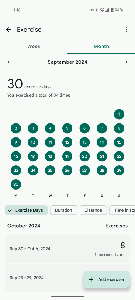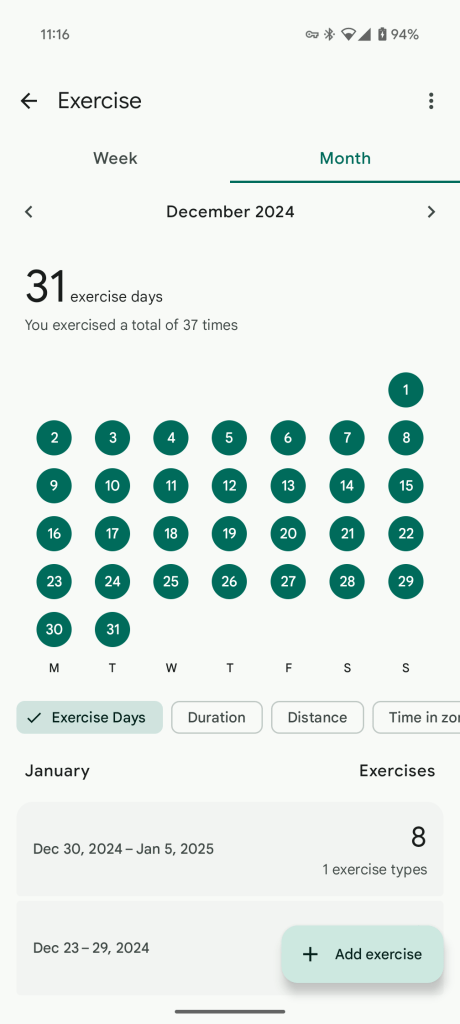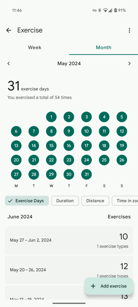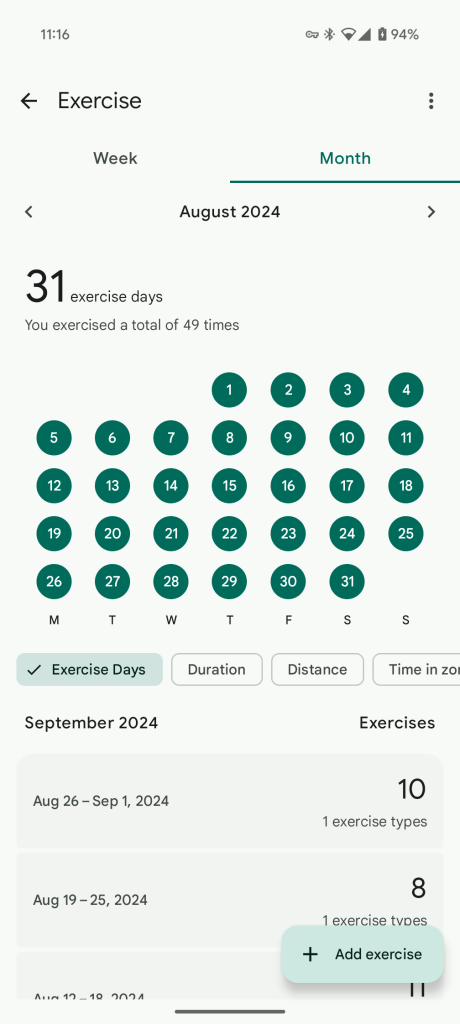 Below are monthly Fitbit exercise reports showing back in March of 2024 where I stopped missing exercise days.