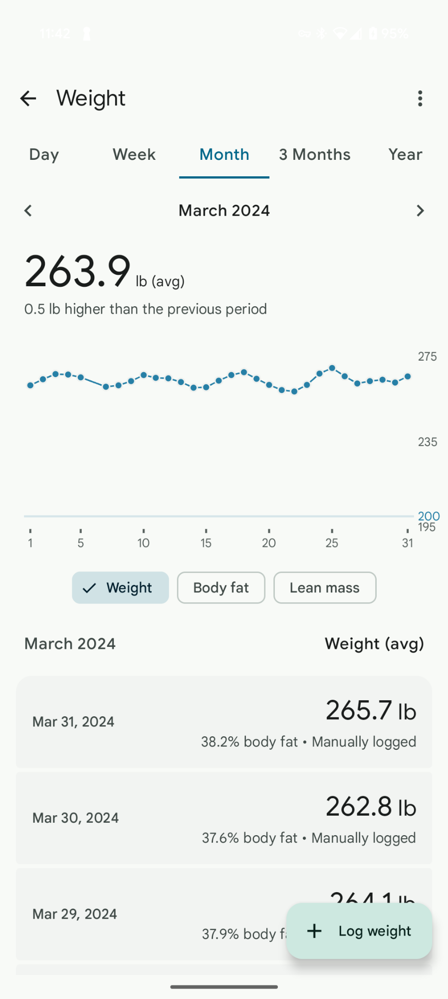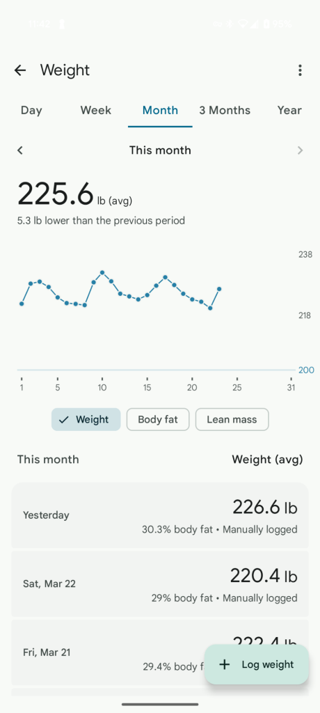 My weight has changed from 263.9 lbs. average to 225.6 lbs. average.