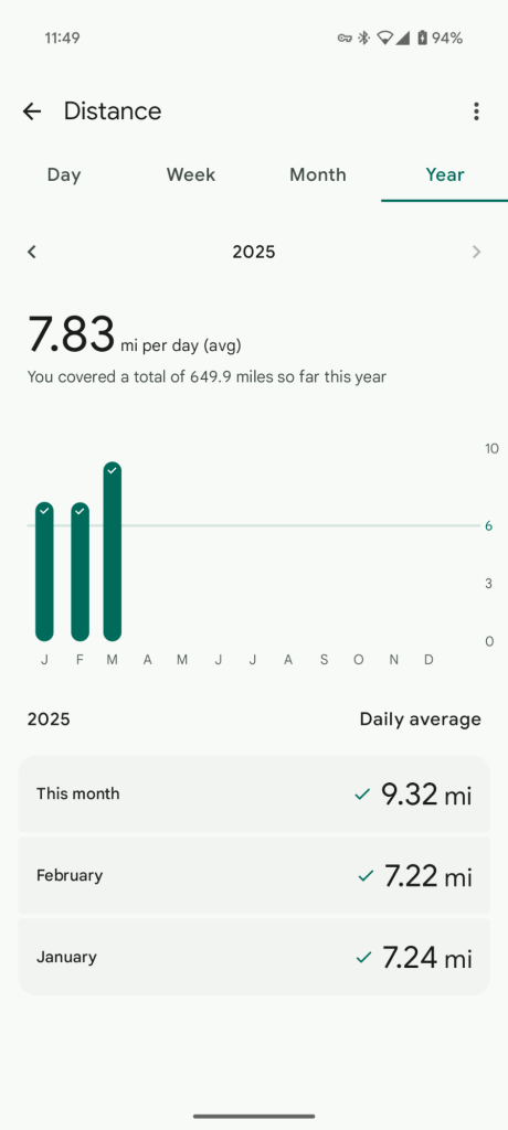 This year I’m averaging 7.83 miles per day for a total of 649.9 miles.