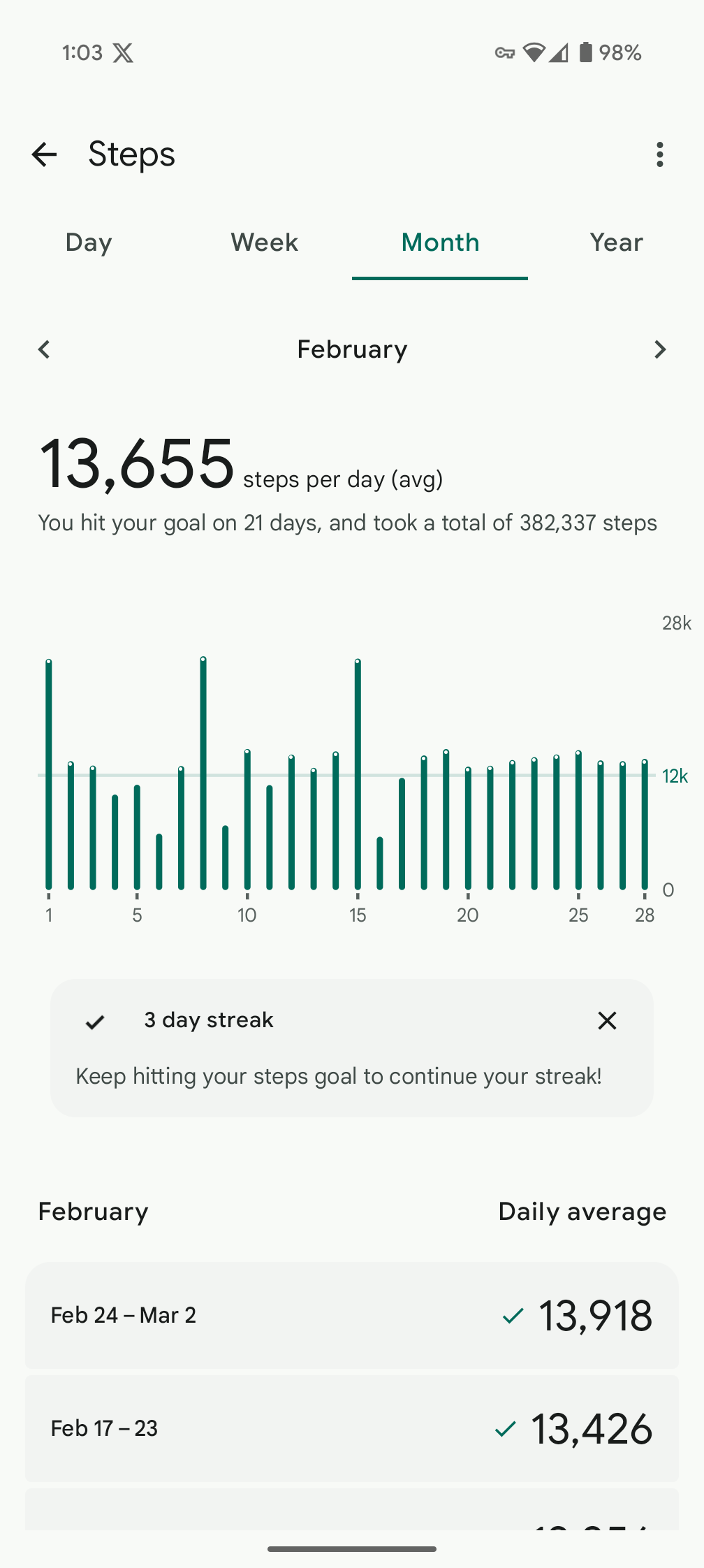 Steps Average Per Day: 16,663 in March, 13,655 February, 6,309 March 2024