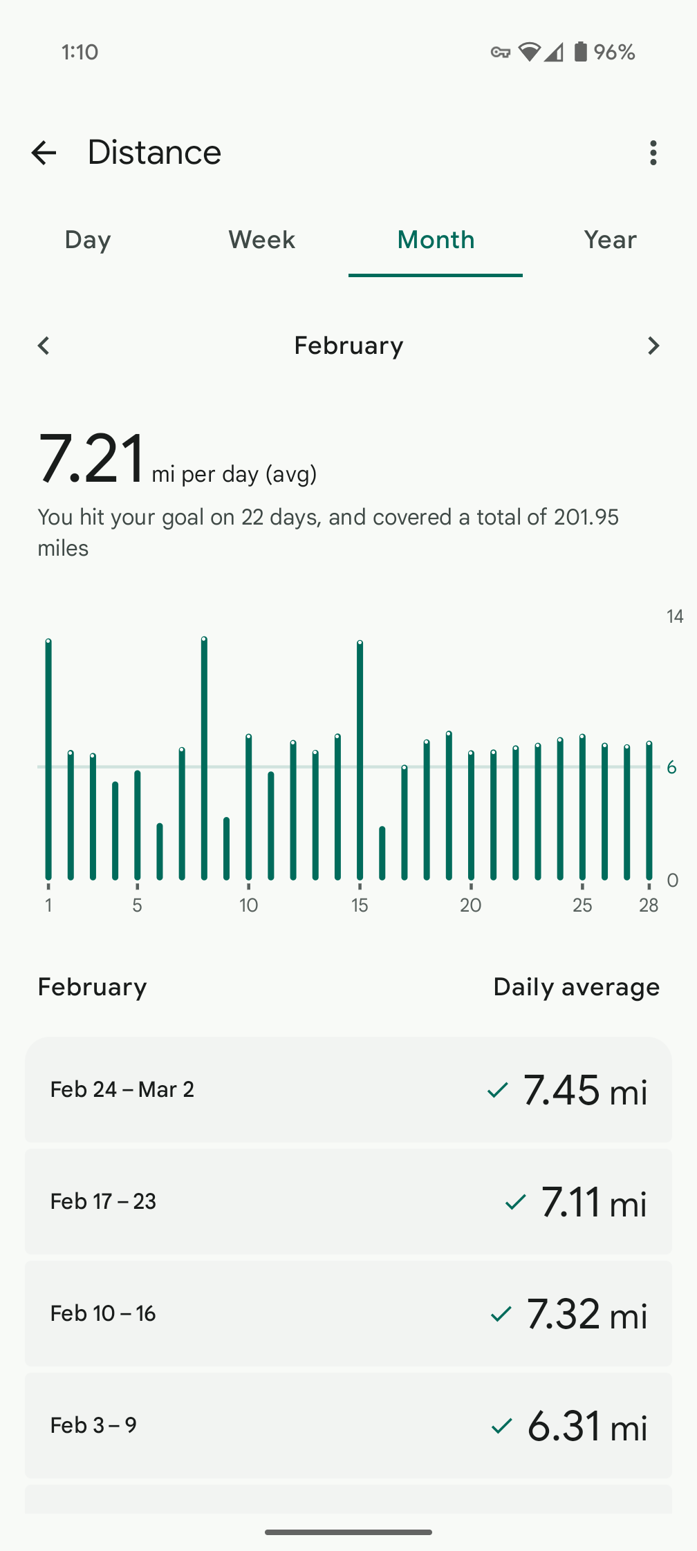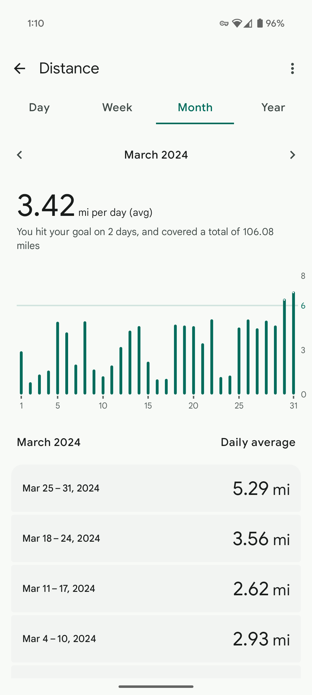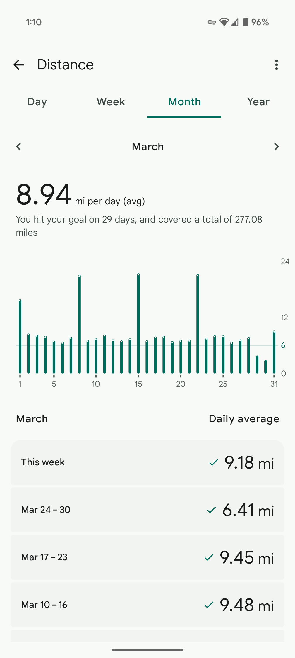 Distance Average Miles Per Day: 8.94 March, 7.21 February, 3.42 March 2024