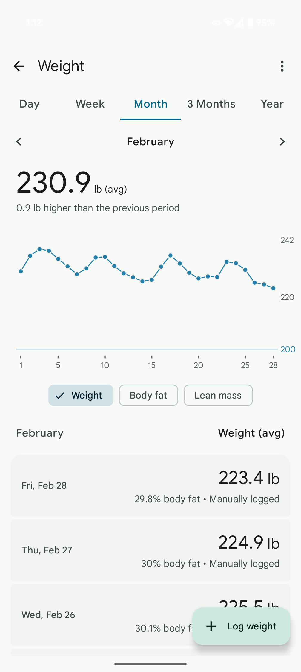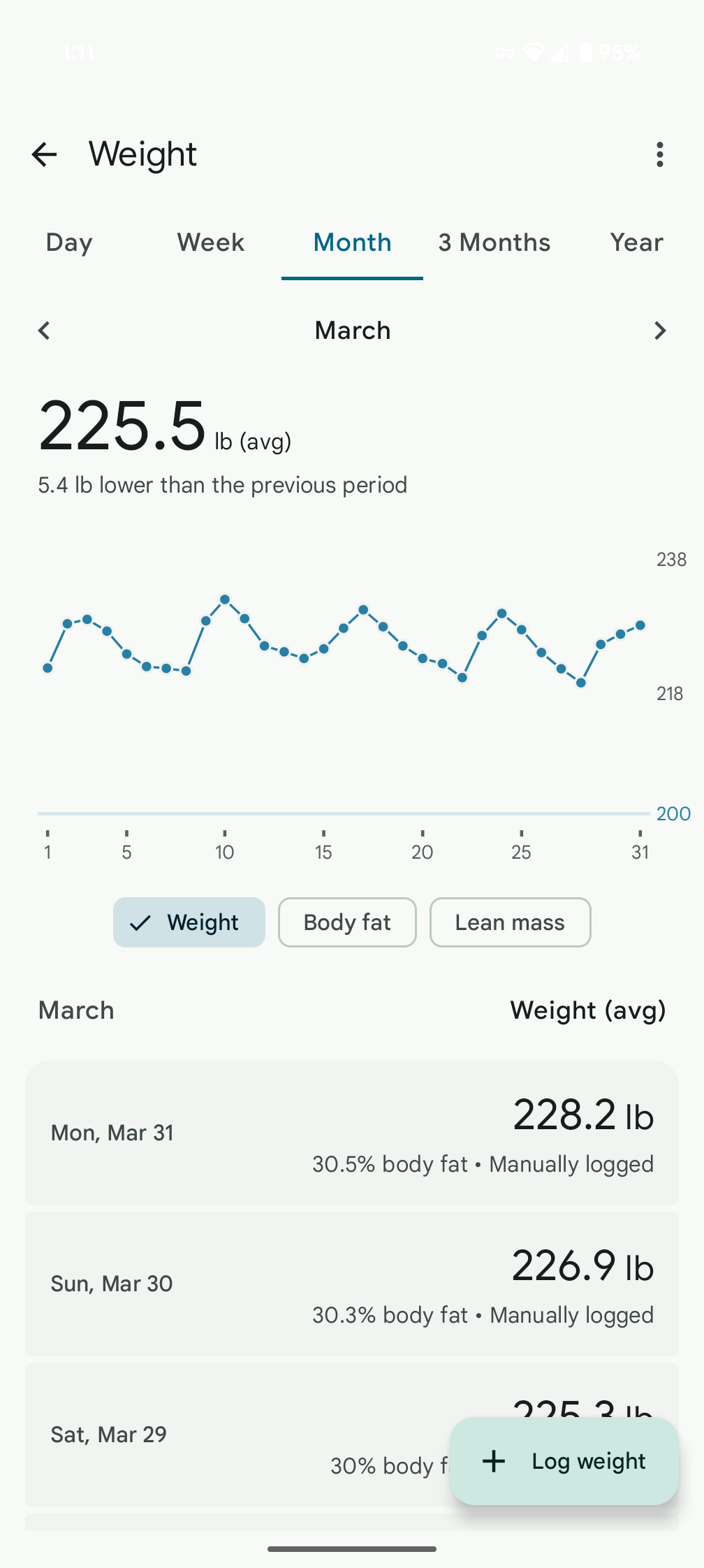 Weight Average: 225.5lbs March, 230.9lbs February, 263.9 March 2024