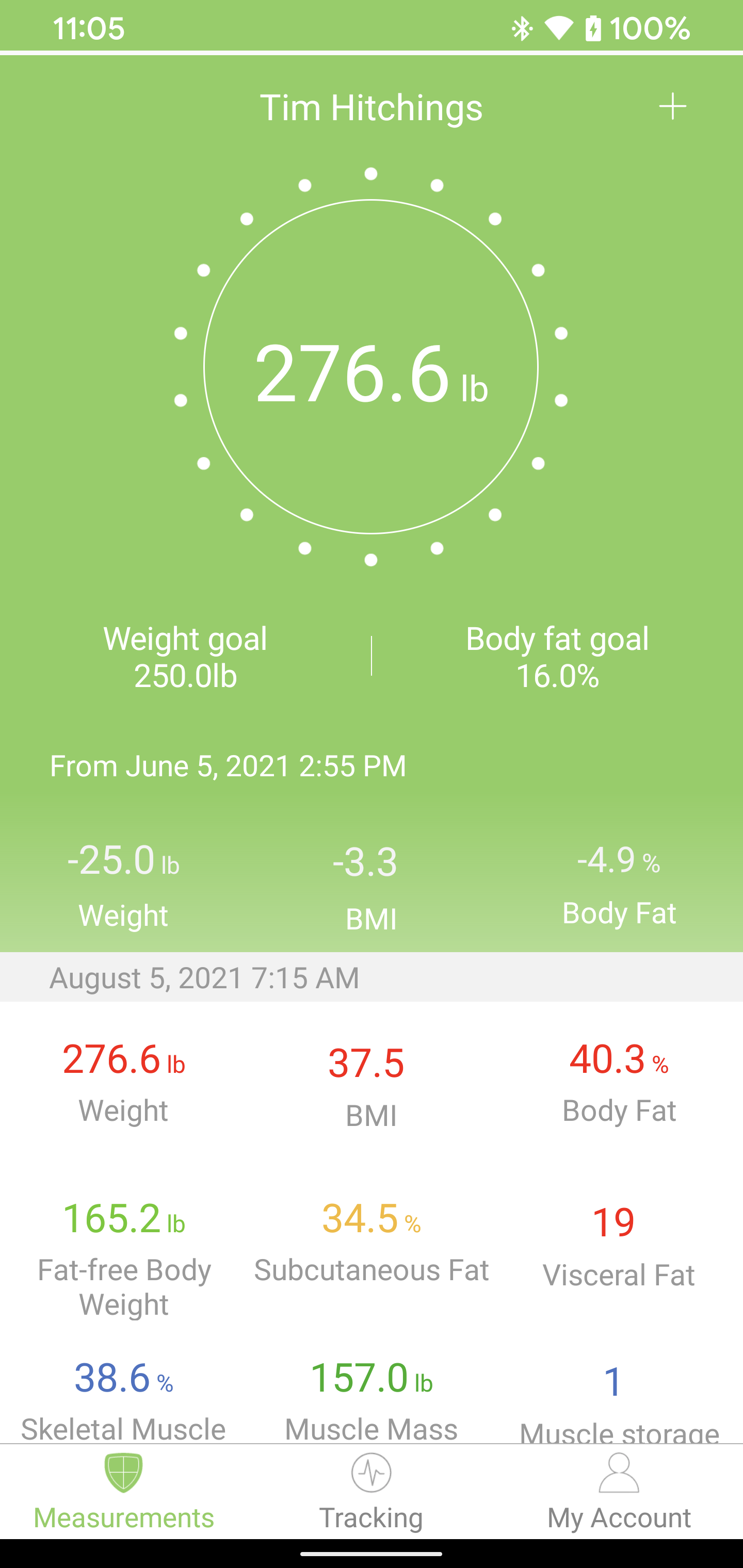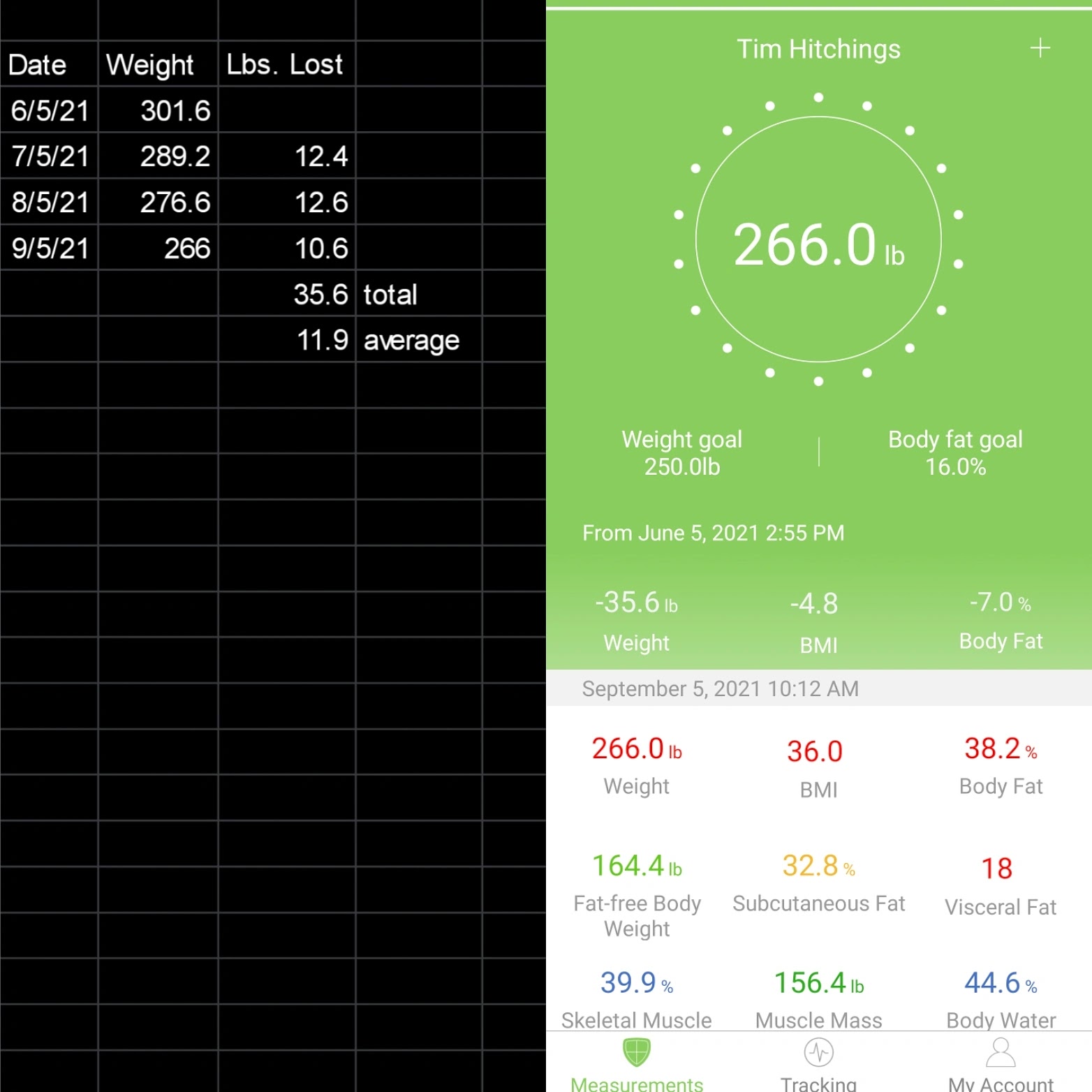 My weight has changed from 263.9 lbs. average to 225.6 lbs. average.