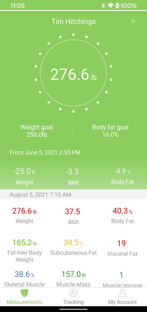 I’m pleased with the first monthly loss report of a total of 16.2 lbs. I know that it will likely be getter harder to lose that much weight each month. It’s apparent that looking at the graph that weekends are where I see a 3lb weight gain. I’m ok with that as I’m using the week to kill that gain and drive the weight down further.